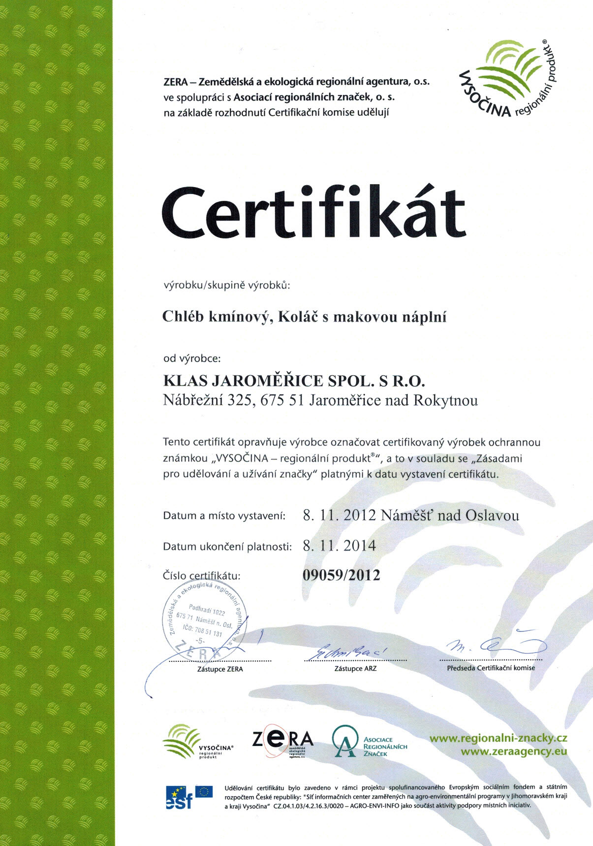 V listopadu roku 2012 jsme obdrželi známku „VYSOČINA regionální produkt®“.